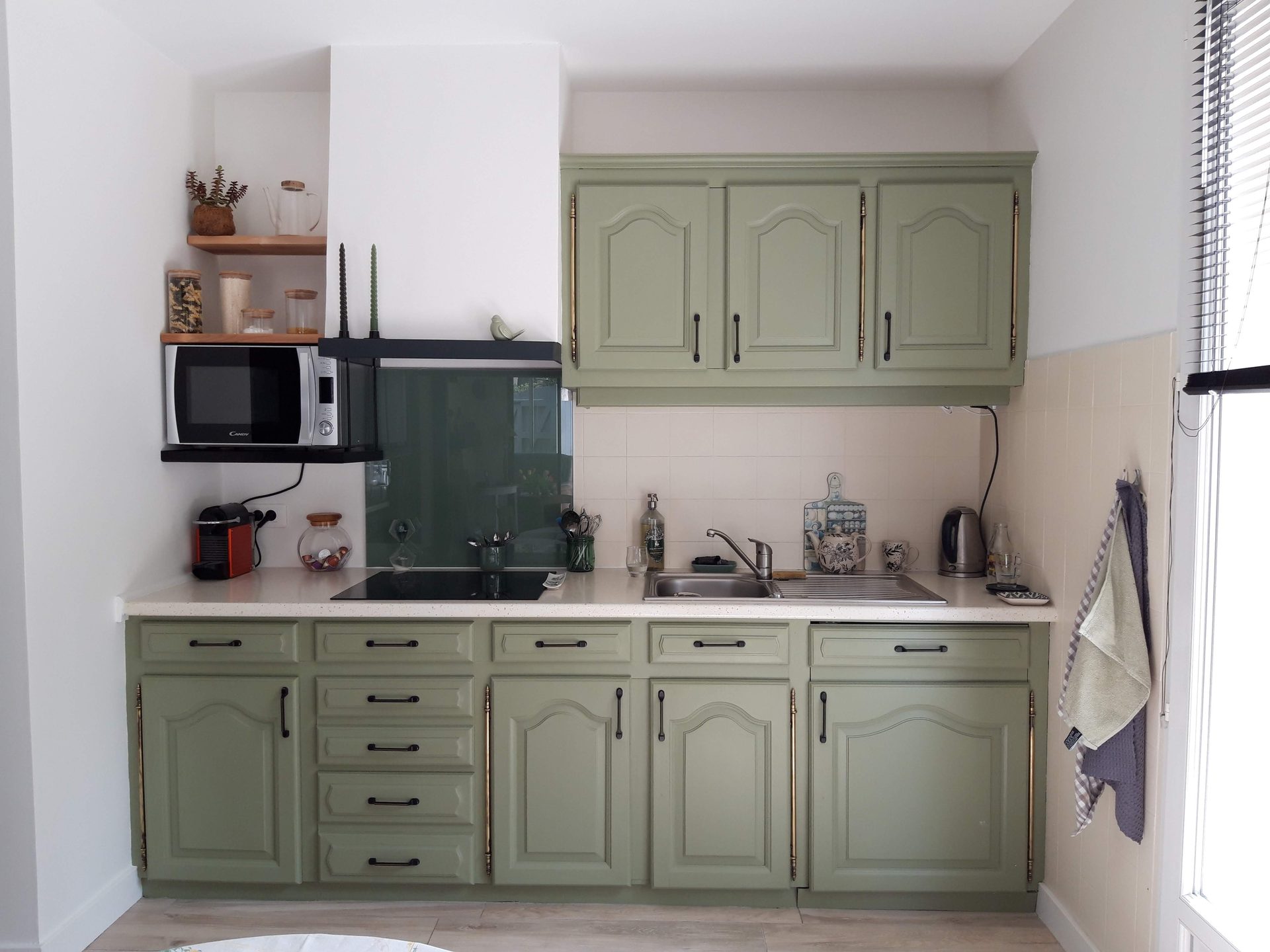 Résultat : la même cuisine, le même plan de travail bois, le même électroménager — mais une ambiance totalement transformée. Plus de lumière, plus d'espace, et une envie de cuisiner qui revient !